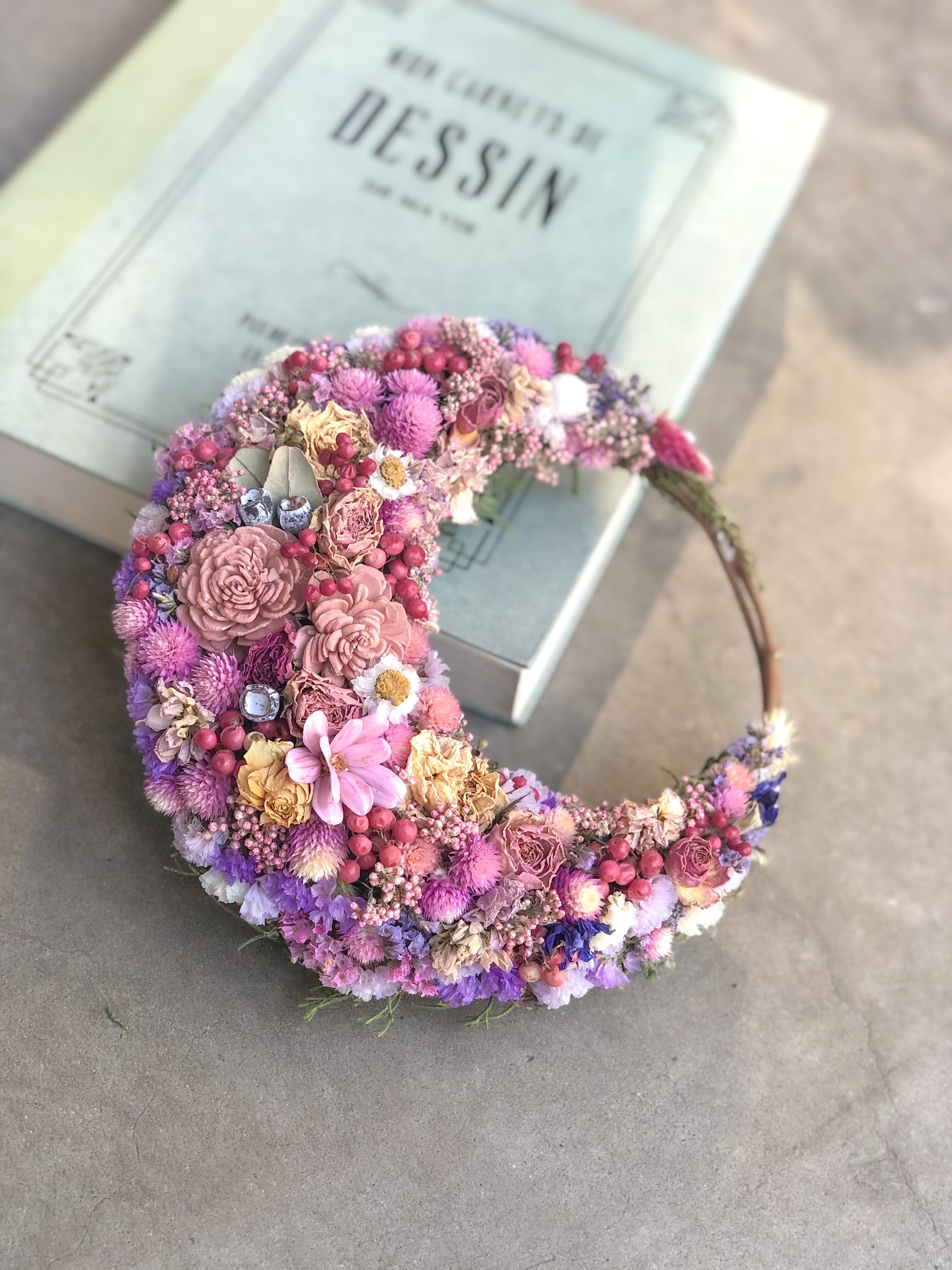 ①明るいピンクの三日月リース