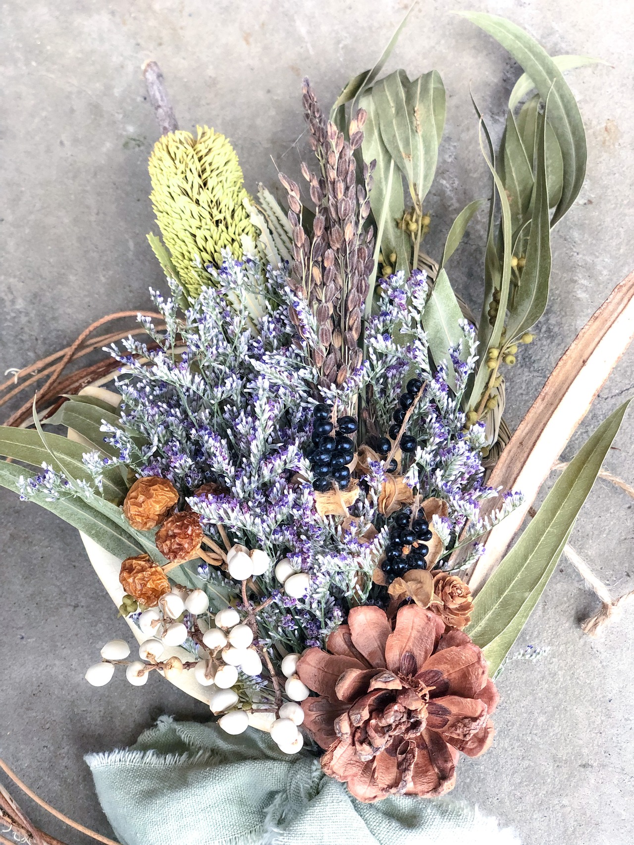 バンクシアと南京ハゼ、ヒオウギが入ったセパレートタイプのしめ縄です。お正月明けにベースから外して飾って頂けます